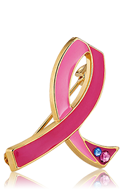 Este broche coleccionable de esmalte rosa es una manera simple y elegante de demostrar nuestro apoyo a la Lucha Contra el Cáncer de Mama. La aparición de una piedra azul en el diseño, representa, también, al 1% de hombres afectados.